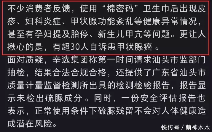 早在七月份,就有媒体报道,辛巴自创卫生巾品牌“棉密码”曾被曝查出有害物超标,且有多名消费者反馈,长期使用这款卫生巾后,身体出现异常。甚至还有孕妇出现胎停等现象。